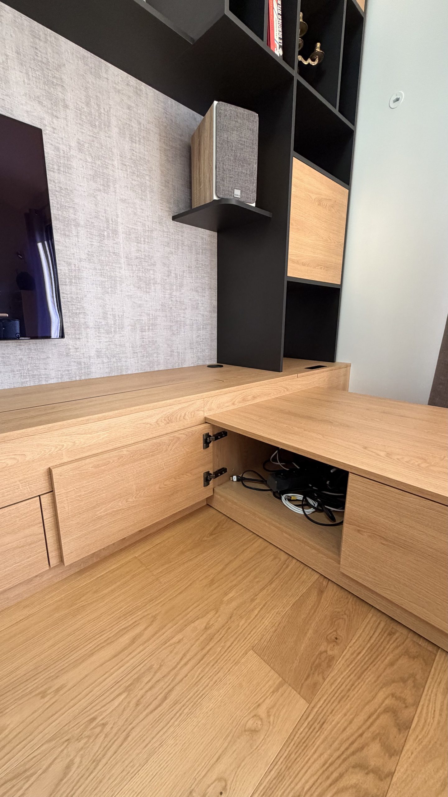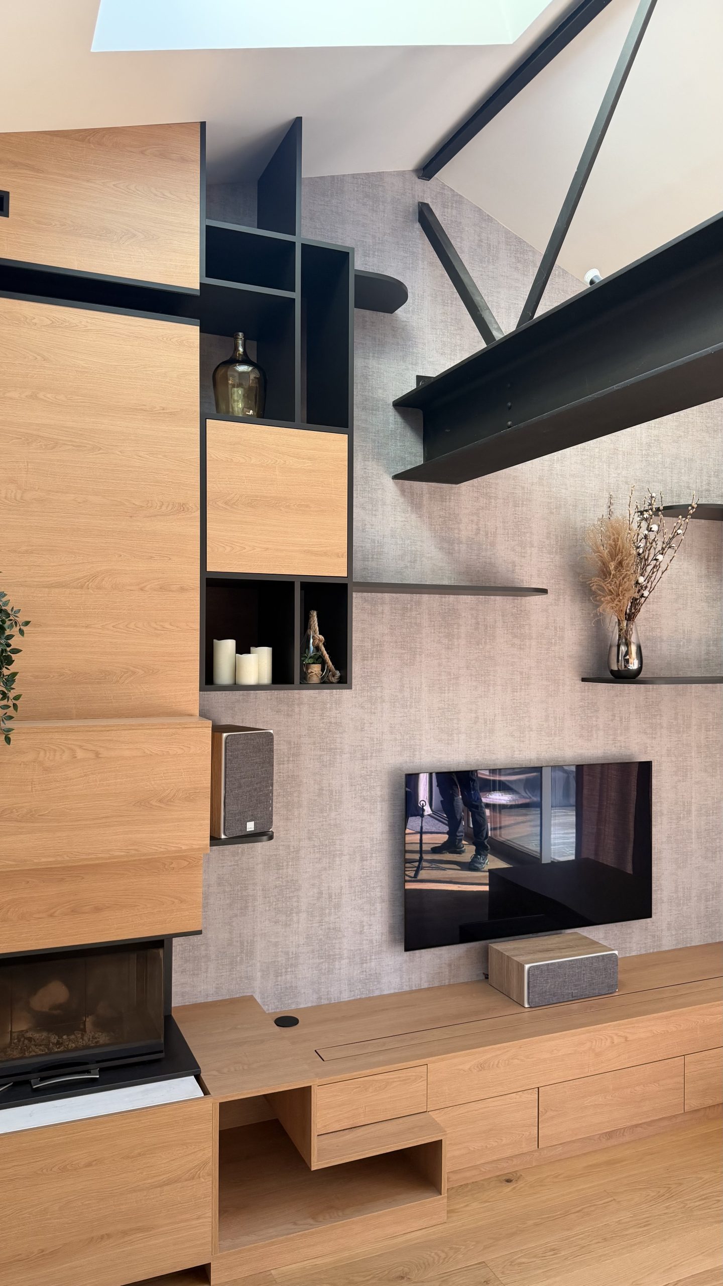 Sur ce projet, l’objectif était ambitieux : transformer entièrement un mur de séjour en un espace à la fois technique, esthétique et ultra fonctionnel, en intégrant un système de vidéoprojection discret au cœur d’un aménagement sur mesure…