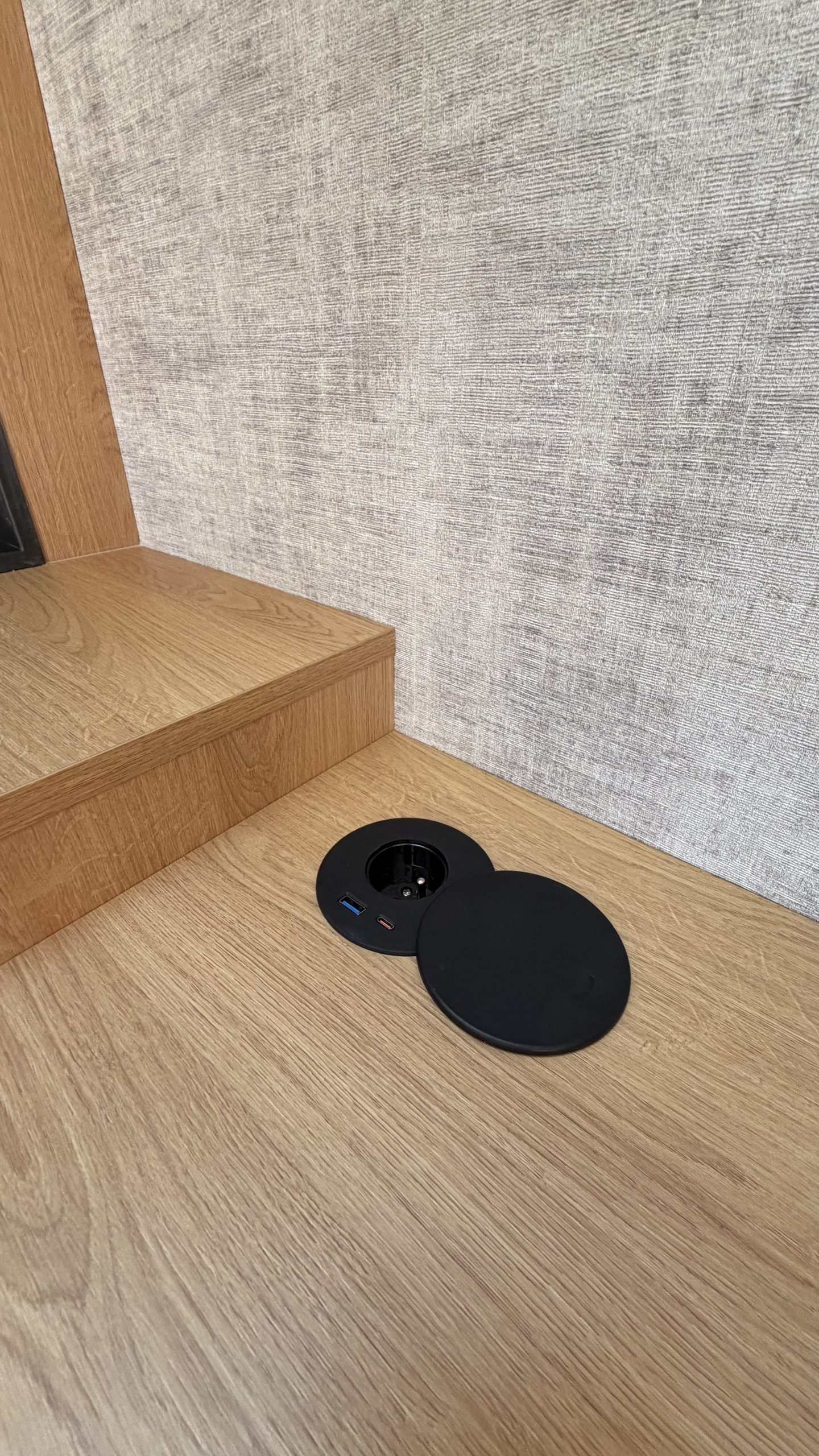 Des passages de câbles et réservations techniques ont été prévus pour garantir un rendu propre, sans fils apparents.